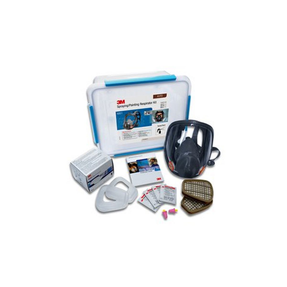 The kit contains the following products: -3M Full Face Respirator 6000 Series (Available S, M & L Sizes) -Pair of 3M Organic Vapour Filters 6051 A1 -Box (5 Pairs) of 3M Particulate Filters 5925, P2 -Pair of 3M Filter Retainers, 501 -3M No-Touch Foam Earplugs P2000 -Class 4 (SLC80: 25dB) -3M Respiratory Protection Guide