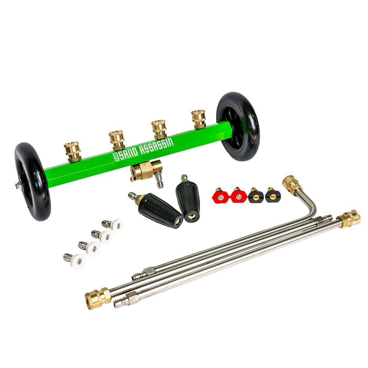 This kit includes everything you need for a comprehensive cleaning experience. It comes equipped with pressure washer adapters compatible with a variety of brands, including Karcher, Gerni, Old Gerni, AR Blue, Bosch, Lavor, and a 1/4 quick connect. The Sand Assassin PRO features jets for three different modes, enabling you to tackle various cleaning tasks effectively.