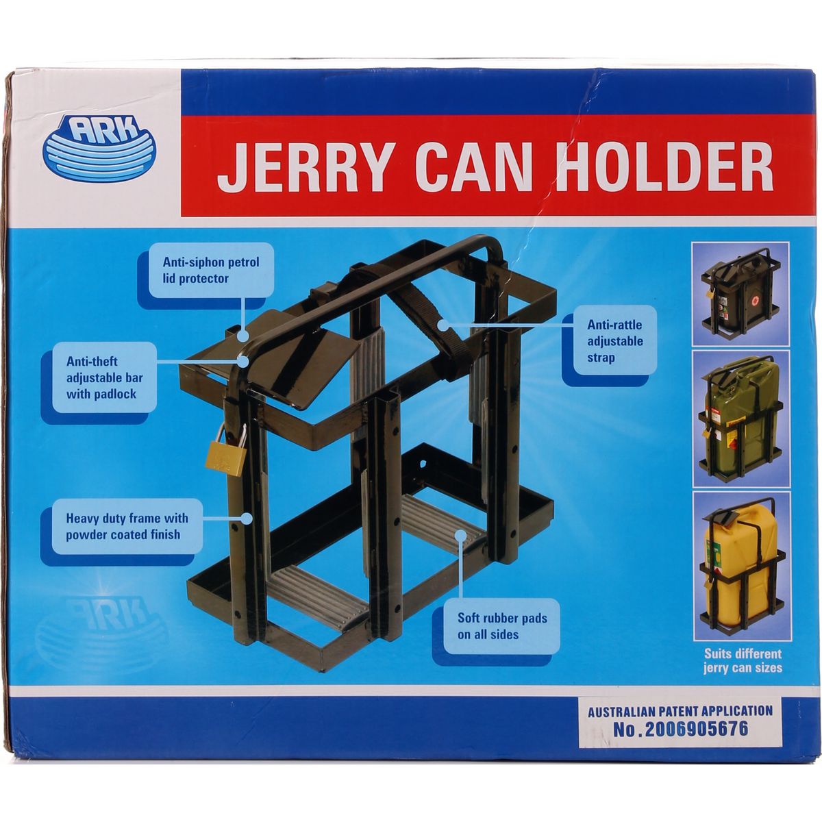 - Heavy-duty steel construction - Black powder coated finish - Designed to suit different sized jerry cans - Anti-rattle strap - Rubber protector pads - Anti-theft design with included padlock